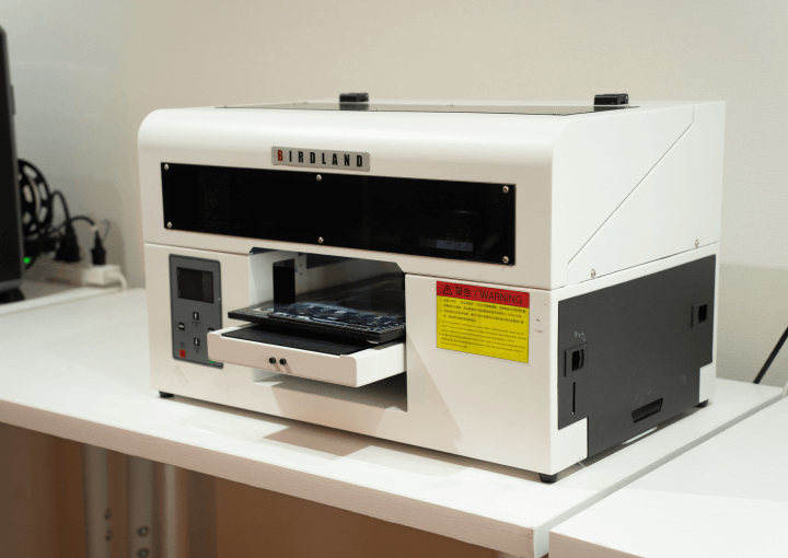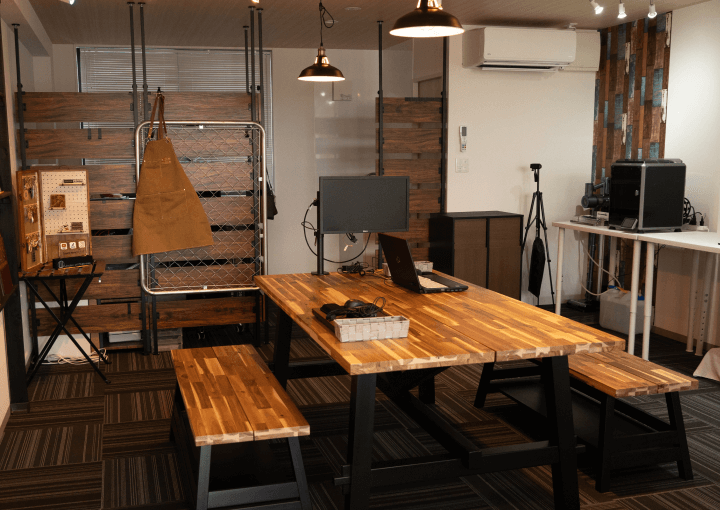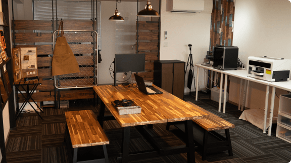 思考を邪魔しないシンプルで心地よい空間には、UVプリンタ・レーザー加工機・3Dプリンタなどを完備。