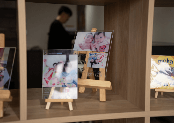 オリジナル写真を使ったアクリル製フォトクロック。写真レイアウトから加工まで体験でき、記念品やギフトにも人気の作品です。